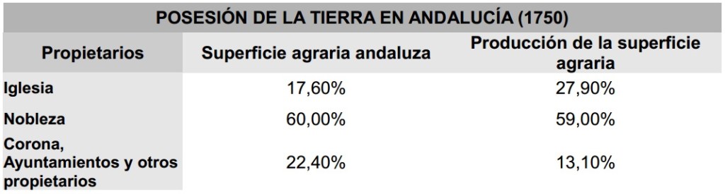 En cuanto a la estructura social andaluza, la masa de proletariado agrícola era abrumadora. Según los censos de 1787 y 1797, el proletariado agrícola conformaba más del 70,9% de la población (en el reino de Granada), cuando no el 83,3% (en el reino de Sevilla). Un poco antes, a mediados del siglo XVIII, nobleza y clero acumulaban el 77,6% de la superficie agraria andaluza y el 86,9% de la producción agraria. Es decir, la mayoría de las tierras y las más productivas. El resto ‒menos de la cuarta parte y las menos productivas‒ se lo repartían entre realengos, propiedades de los ayuntamientos y propietarios de las clases no privilegiadas.